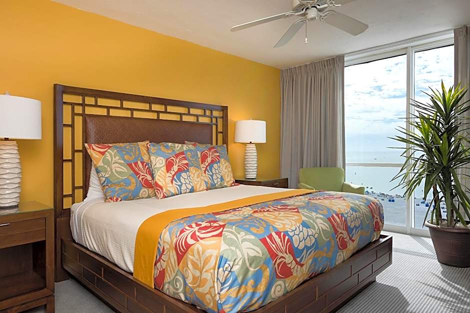 Expansive Three Bedroom Bay View Suite has one king bed and two queen beds. Two private baths. Screened balcony. Fully-appointed kitchen that includes cookware. Living room.